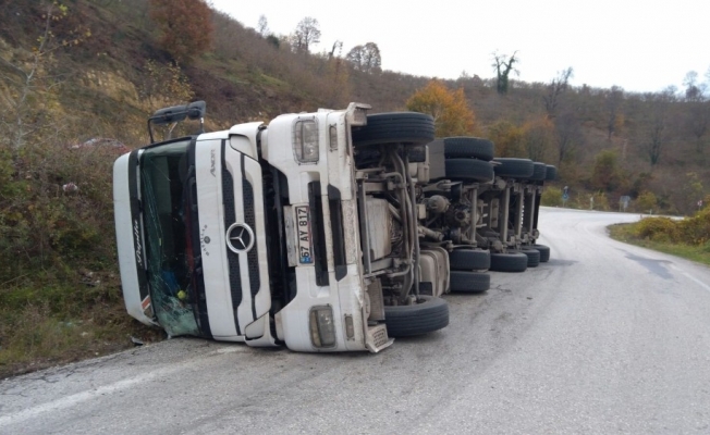 DÜzce’nin Akçakoca ilçesi çevre yolu Edilli ağzı mevkiinde virajı alamayan tır devrildi.