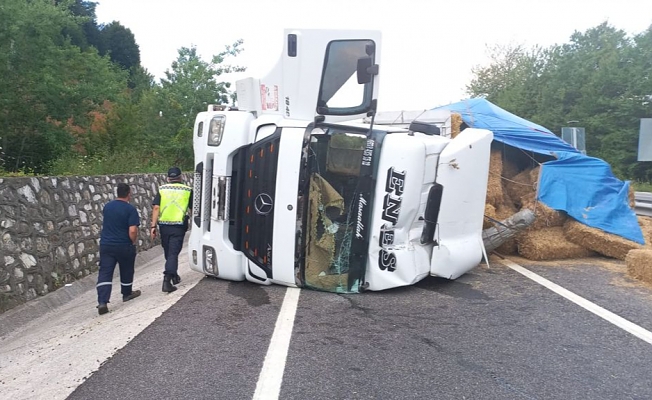 D-655 Karayolu Akçakoca istikametinde kontrolden çıkan saman yüklü tır virajda yan yattı. Sürücünün şans eseri yara almadan atlattığı kaza nedeniyle yol 4 saat trafiğe kapalı kaldı.