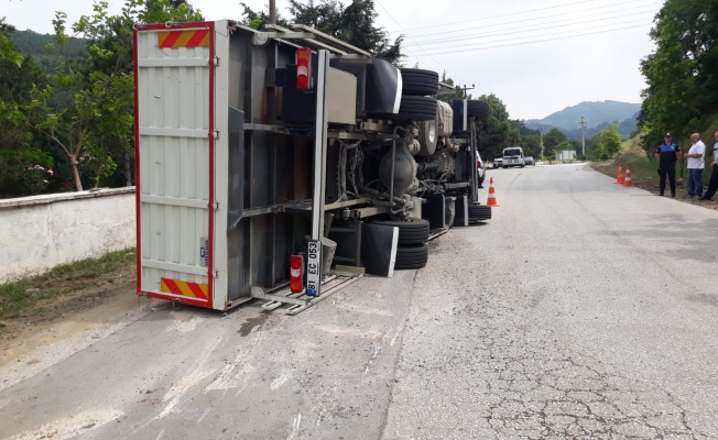 Alınan bilgiye göre, Aydın Kuruoğlu idaresindeki 81 EC 053 plakalı kamyon, Gümüşova ilçesi Merkez Mahallesi Şifalı Su Caddesi'nde devrildi.