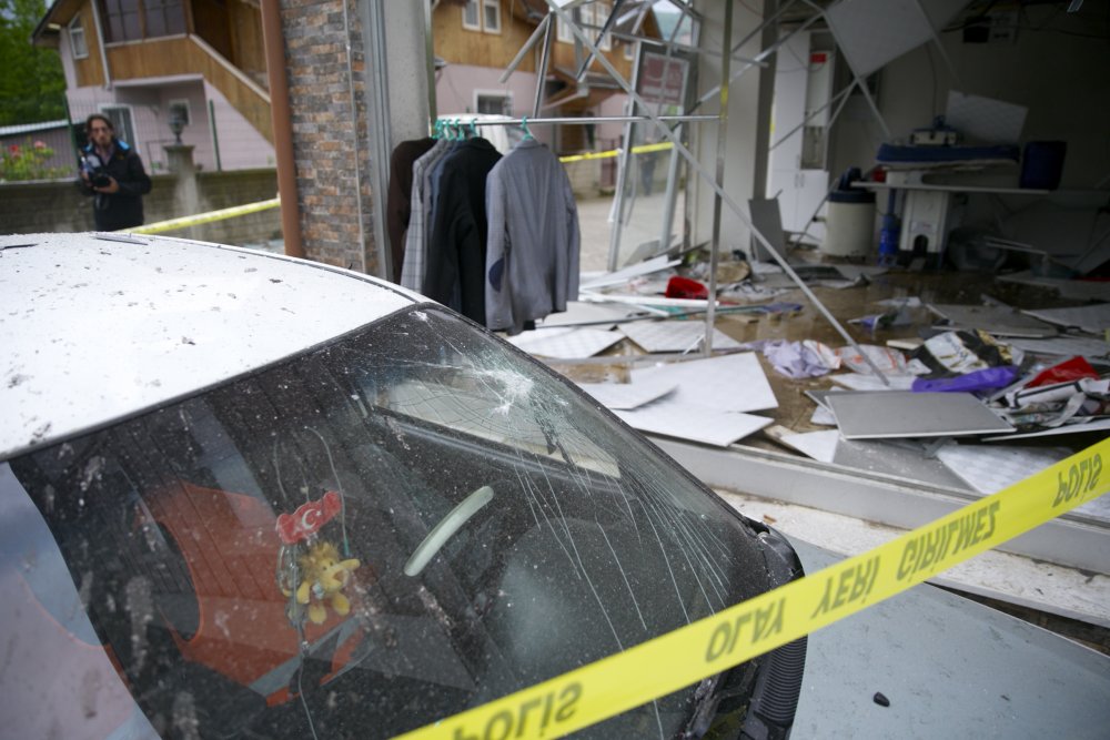 Patlamada büyük oranda hasar gören iş yeri kullanılmaz hale gelirken, kaldırımdaki bir araç da hasar aldı.