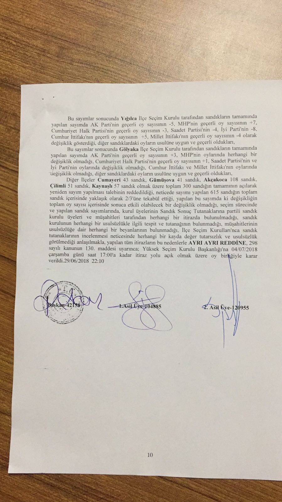 MHP Düzce İl Başkan Yardımcısı ve Basın Sözcüsü tarafından yapılan yazılı açıklamada farkın giderek arttığı ve kontrollerin devam ettiğine vurgu yapıldı. Oyların tekrardan sayılıp sayılmaması ile ilgili son kararı YSK oluşturulan kurulun karar vereceği açıklandı.