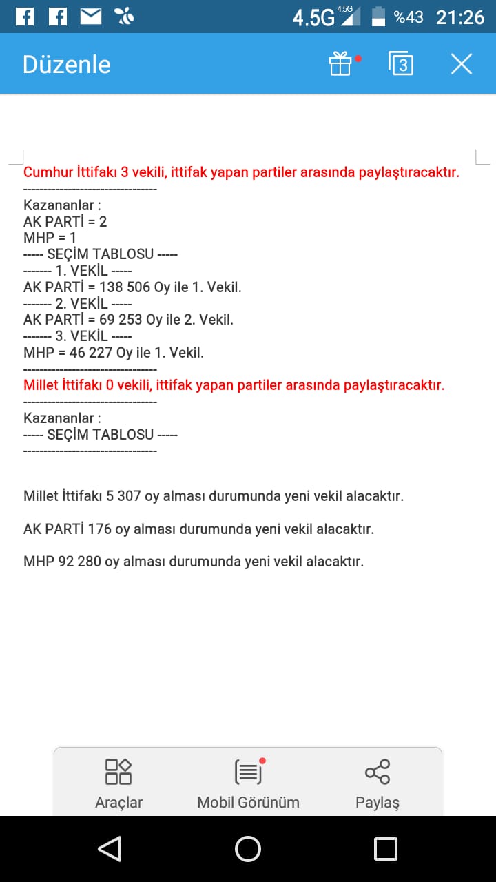 AK PARTİ = 138 506 Oy ile 1. Vekil, AK PARTİ = 69 253 Oy ile 2. Vekil ve MHP = 46 227 Oy ile 1. Vekil aldığı bilgisi paylaşıldı.
