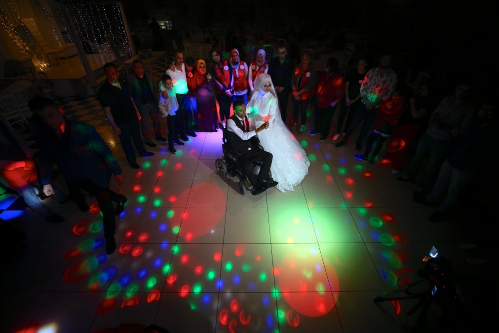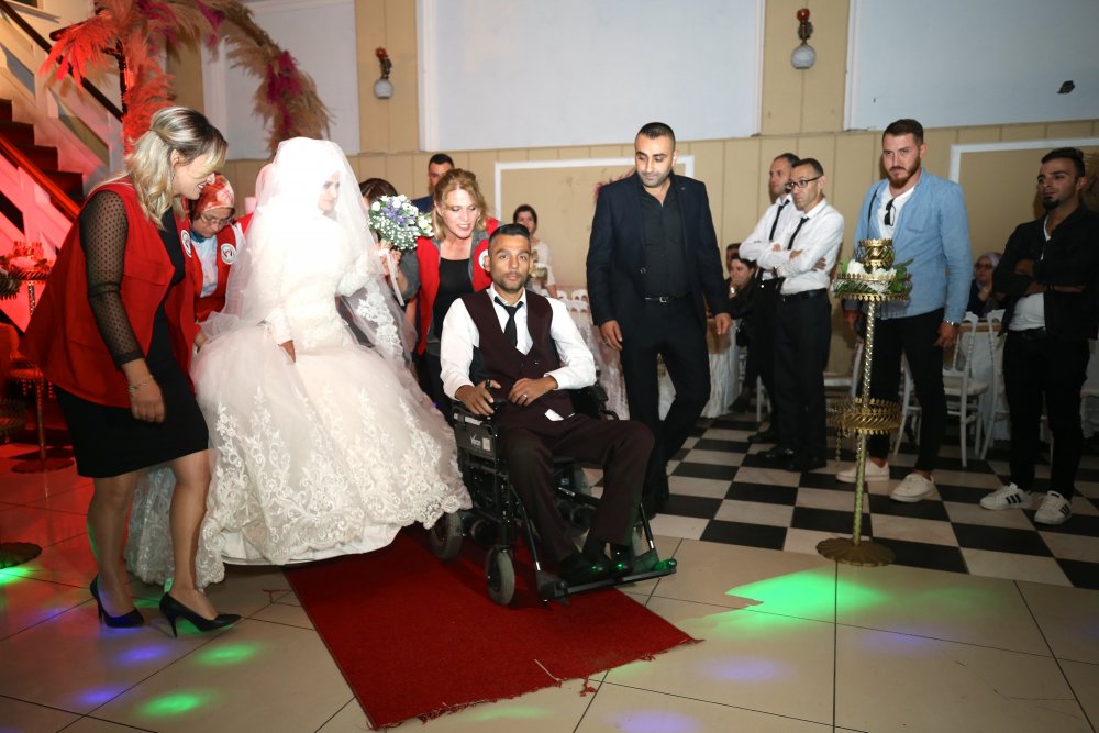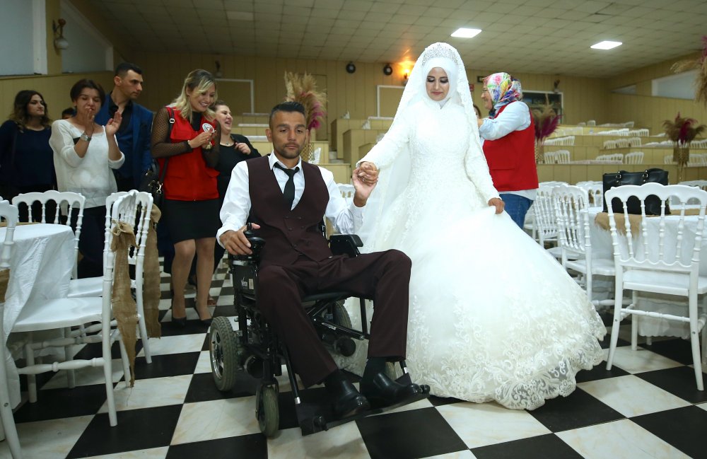 Çiftin yakınları ve arkadaşlarıyla gönüllülerin katıldığı düğünde gazetecilerin sorularını yanıtlayan damat Serdar Yirmibeş, 20 yaşında kaza geçirerek boynunu kırdığını söyledi.