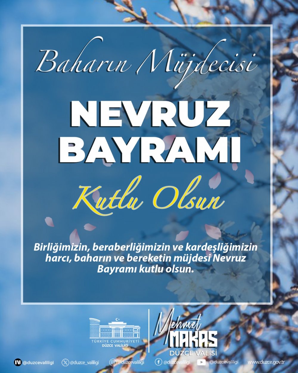Nevruz Bayramı ile ilgili Düzce Valisi Mehmet Makas kutlama mesajı yayımladı. Mesajında tüm Düzce halkı ve Türk Dünyası’nın nevruz bayramını kutlayan Vali Makas, şu ifadelere yer verdi:
