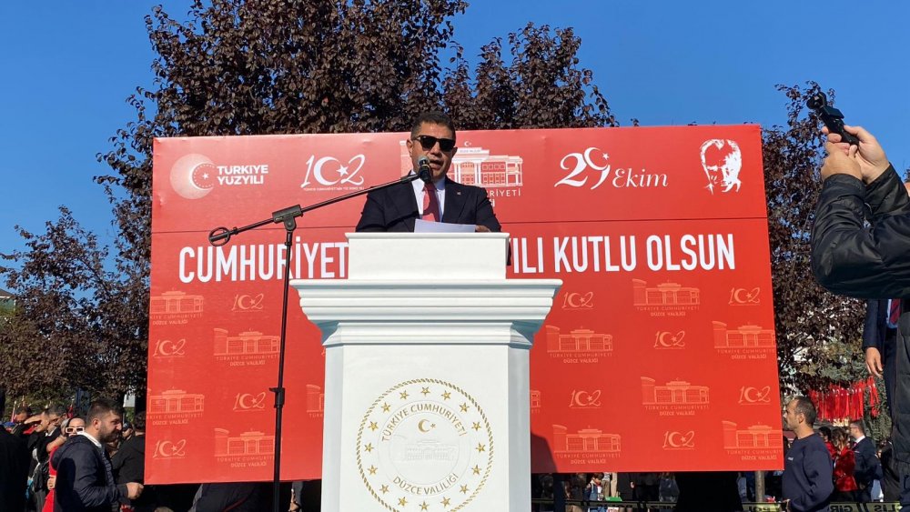 Törende konuşma yapan Düzce Valisi Selçuk Aslan, Cumhuriyet’in önemine değinerek, Cumhuriyet; bu milletin hürriyet sevdasının, bağımsızlık tutkusunun, yeniden dirilişinin adıdır. 29 Ekim 1923’te, bir millet sadece devletini kurmadı; onurunu, özgürlüğünü, kaderini ve geleceğini kendi ellerine aldı. Cumhuriyet; sadece bir yönetim biçimi değil, bir varoluş destanıdır. Bizler, bu destanın devamını yazmakla sorumluyuz. Atalarımız canlarını ortaya koyarak bu toprakları bizlere nasıl  vatan yaptıysa, bizler de aklımız, emeğimiz, sevgimiz ve üretimimizle bu vatanı geleceğe aynı sorumluluk ve bilinçle taşımalıyız. Cumhuriyet, yalnızca geçmişten edindiğimiz bir miras değil, geleceğe uzanan bir sorumluluk zinciridir. Düzce, bu sorumluluğu en iyi taşıyan şehirlerden biridir. Kurtuluş Savaşı yıllarında Anadolu’nun pek çok yerinde olduğu gibi Düzce halkı da vatanın birliği ve bütünlüğü için mücadele etmiş, fedakârlık göstermiştir. Bugün de aynı ruh, azim ve kararlılık Düzce’nin her köşesinde yaşamaktadır. Büyük zorluklarla sınansa da her defasında küllerinden doğan bu kadim şehir, Cumhuriyet'in dayanıklılığını ve milletimizin azmini en güzel şekilde temsil etmektedir. Cumhuriyetin ışığı, Düzce’nin dağlarından ovalarına, Düzce ovasının güneşli sabahlarından Akçakoca’nın maviliklerine kadar her yere yansımaktadır. Bu ışık,  okulda okuyan her çocuğun gözlerinde, üreticinin alın terinde, annenin duasında ve her bir gencin hayalinde yanmaktadır. Sevgili gençler; Cumhuriyet sizlere emanettir. Bu emaneti koruyacak olan sizlersiniz. Kitapla, bilgiyle, teknolojiyle, sanatla, ahlakla donanmış bir gençlik; Düzce’nin yarınlarını, Türkiye'nin geleceğini inşa edecek olan en büyük güçtür. Unutmayın ki Cumhuriyet sizden sadece gurur duymanızı değil, onu yaşatmanızı ve yüceltmenizi ister. Cumhuriyetimizin ikinci yüzyılına girerken, “Türkiye Yüzyılı” hedefiyle daha güçlü, daha üretken, daha müreffeh bir ülke inşa etme gayretindeyiz. Bu hedefte Düzce, doğası, insanı, sanayisi, tarımı, üniversitesi ve genç nüfusuyla ülkemizin parlayan bir yıldızı olmaya adaydır. Devletimizle milletimizin omuz omuza olduğu her alanda, Düzce’nin başarı hikâyesi büyümeye devam edecektir. Bu duygularla, başta Cumhuriyetimizin kurucusu Gazi Mustafa Kemal Atatürk ve silah arkadaşları olmak üzere, bu toprakları bize vatan kılan tüm kahramanlarımızı saygı ve minnetle anıyorum. Cumhuriyetimizin 102. yılı kutlu olsun.” ifadelerine yer verdi.