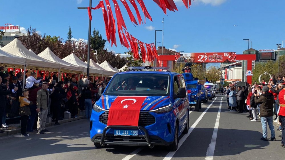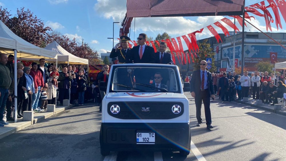Törende Cumhurbaşkanı Recep Tayyip Erdoğan’ın günün anlam ve önemini anlatan mesajının okunmasının ardından, Düzce Valisi Selçuk Aslan, Düzce Garnizon Komutanı Albay Abdulvahap Bozkurt ve Düzce Belediye Başkan Yardımcısı Hasan Günden, Düzce’de bir firma tarafından üretilen milli elektrikli araca binerek, törene katılanların Cumhuriyet Bayramını kutladı.