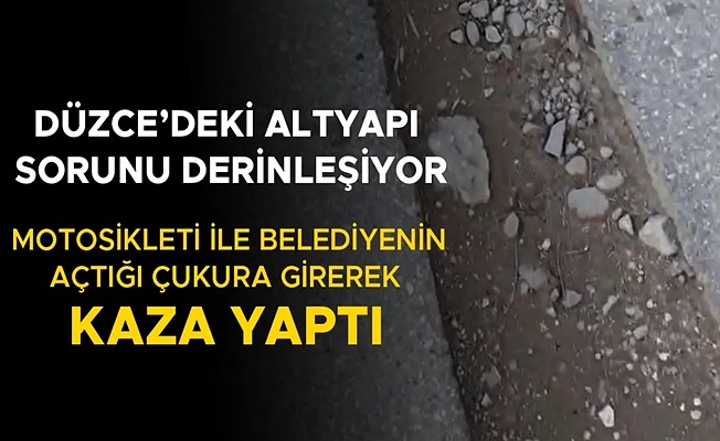 Düzce’de kent merkezinde altyapı sorunlarına yenileri eklenmeye devam ediyor. Bu kez ise altyapı sorununun ortaya çıktığı son adres Hamidiye Mahallesi oldu. İddiaya göre, bir vatandaş Belediye ekipleri tarafından yapılan çalışmaların ardından kapatılmayan çukura motosikleti ile girerek, kaza yaptı.