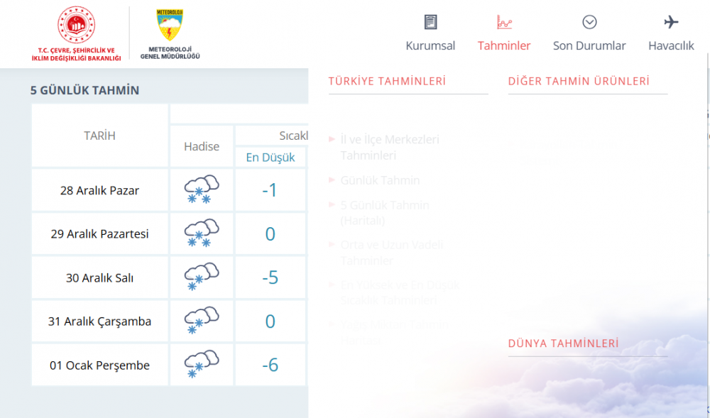 Meteorolojinin yayımladığı son hava durumu tahminlerine göre, kar yağışı 1 Ocak 2026 Perşembe gününe kadar etkisini sürdürecek. Kar yağışının özellikle yüksek kesimlerde daha yoğun şekilde görülmesi tahmin ediliyor.