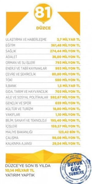 Düzce’ye toplamda 10 Milyar 14 Milyon TL yatırım yapıldı. Düzce’ye Ulaşım ve Haberleşme de 3,7 Milyar TL, Eğitime 361,48 Milyon TL, sağlık için 274,44 Milyon TL, Adalet için 36,80 Milyon TL, Orman ve Su İşleri için 793 Milyon TL, Enerji Tabi Kaynaklar 993 Milyon TL, Çevre ve Şehircilik  80,80 Milyon TL, Toki 580 Milyon TL, İlbank 1,5 Milyar TL, Gıda Tarım ve Hayvancılık 703 Milyon TL, Aile ve Sosyal Politikalar 592 Milyon TL, Gençlik ve Spor 659 Milyon TL, Kültür ve Turizm 18,80 Milyon TL, Vakıflar 1,10 Milyon TL, Bilim Sanayi ve Teknoloji 195,57 Milyon TL, İçişleri 159,57 Milyon TL, Maliye Bakanlığı 123,42 Bin TL, Çalışma 98,08 Milyon TL ve Kalkınma Ajansı için 29,54 Milyon TL yatırım yapıldı.