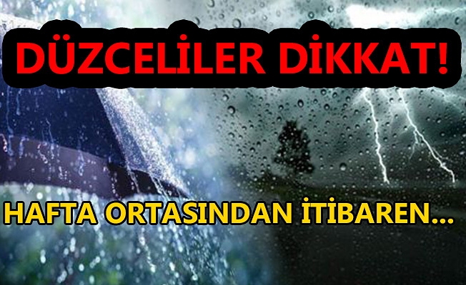 Meteoroloji tarafından yapılan uyarıda, hafta ortasından itibaren şiddetini arttırması ve gök gürültülü şeklinde görülmesi beklenen sağanak yağışlara karşı Düzceli vatandaşları, ani su taşkınları, sel, yıldırım düşmesi ve trafikte yaşanabilecek olumsuzluklara karşı uyarıda bulundu.