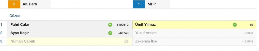 AK PARTİ = 138 506 Oy ile 1. Vekil, AK PARTİ = 69 253 Oy ile 2. Vekil ve MHP = 46 227 Oy ile 1. Vekil aldığı bilgisi paylaşıldı.