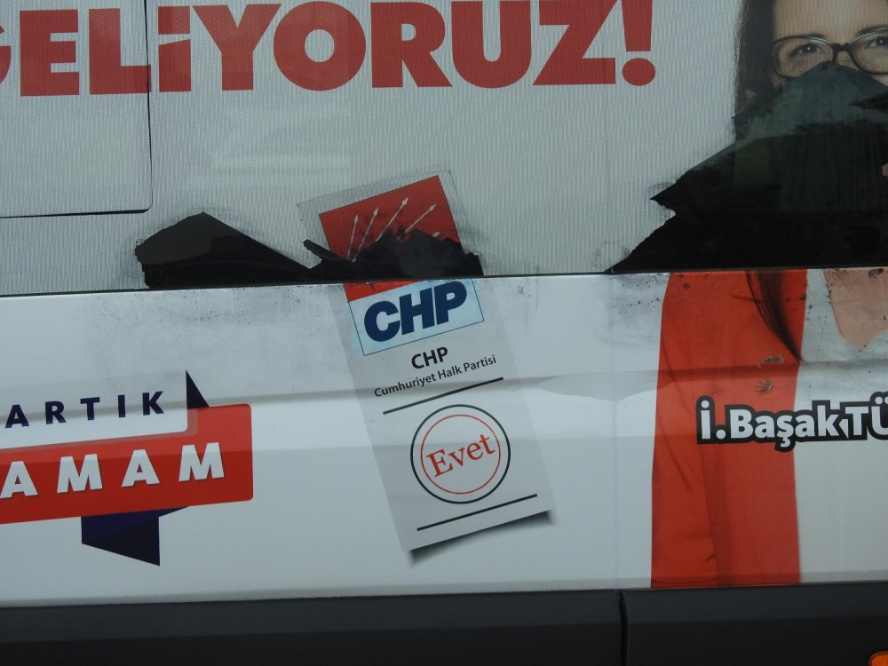 İçinde kimsenin olmaması yapılacak olan olası bir oyın da önüne geçmiş oldu. Cumhuriyet Halk Partisi Düzce Milletvekili adaylarının fotoğraflarıyla giydirilen otobüse yapılan saldırı sonucunda sol bölümde ki giydirilmiş alanda bulunan vekil adaylarının resimleri söküldü.