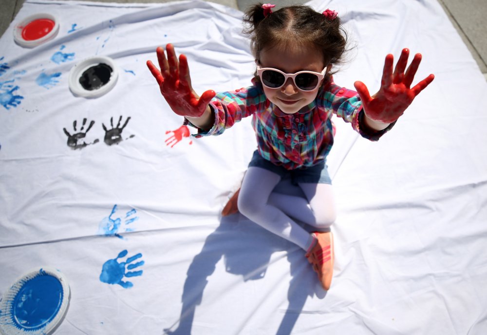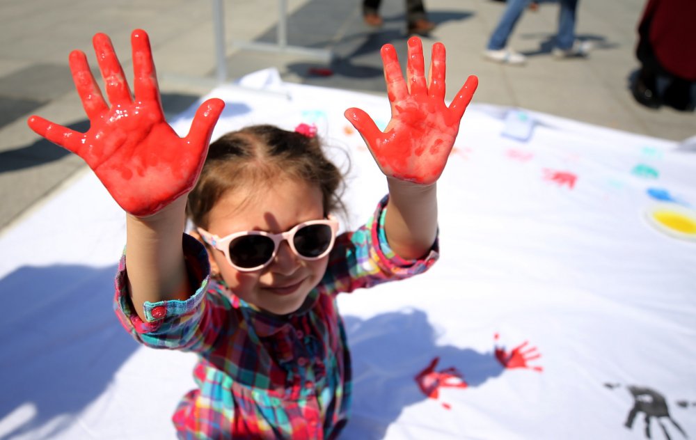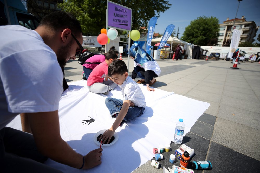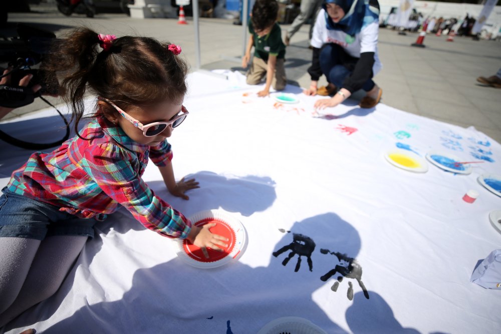 Düzce Üniversitesi Yeşilay Topluluğu'ndan katılan öğrencilerin de destek verdiği etkinlik kapsamında farklı renklerdeki boya kutularına ellerini sokan katılımcılar, yere serilen beyaz örtüleri boyuyor.