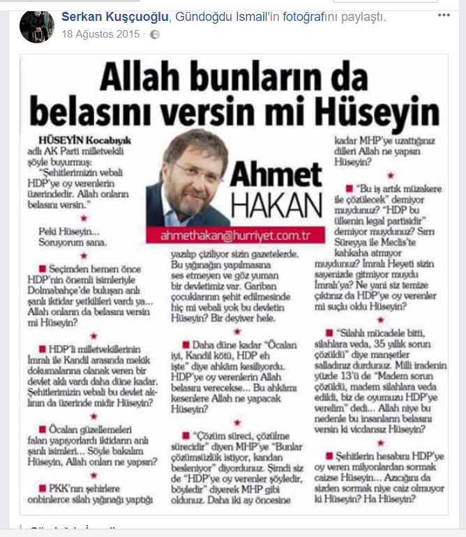 İşte partiye ve reise verip veriştiren gezicilerden sözcü tvden ak partiye sayıp söven ile bilinen Bülent Tezcanın videolarını paylaşan Yeğen Kuşçuoğlu’nun o paylaşımları. Hem ak parti delegesi hemde akıl tutulması halinde partisine gider yapan Serkan Kuşçuoğlunun vereceği oyun bu misyonu ne kadar temsil edeceği tartışma konusu oldu.