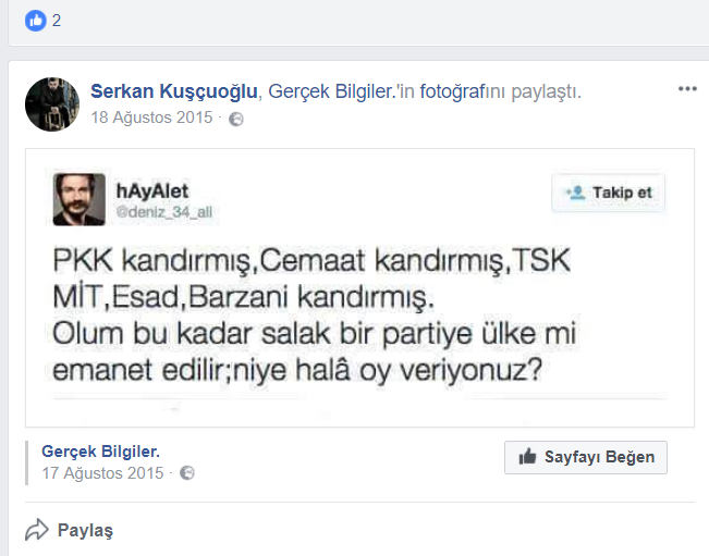 Tarih 18 Ağustos 2015. Serkan Kuşçuoğlu Gerçek Bilgiler sin sosyal paylaşım hesabında bu salak partiye ülke teslim mi edilir konulu fotoğrafı paylaşıyor.