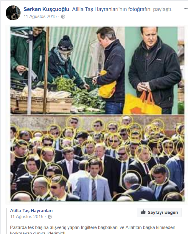 Tarih 11 Agustos 2015. İngiltere Başbakanı İle Cumhurbaşkanı Recep Tayyip Erdoğan arasında kıyaslama yapılan adeta İngilizi yüceltip kendi Reisini hafife alacak paylaşım. Bu paykaşımı yapan Kişi ise Ak partinin delegesi.