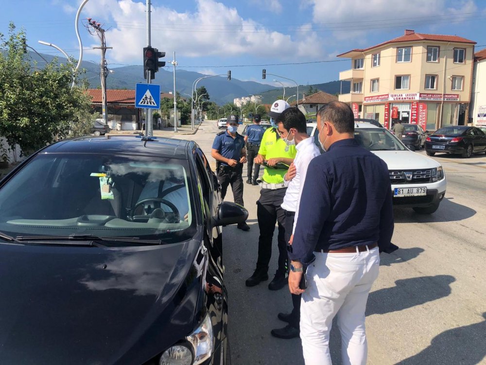 Sürücülere ve yanlarında bulunan yolculara çikolata ve kolonya ikram eden Çilimli Belediye Başkanı Muhsin Yavuz ve İlçe Kaymakamı Onur Şan, aynı zamanda görevli polis ekipleri ile de bayramlaştılar.