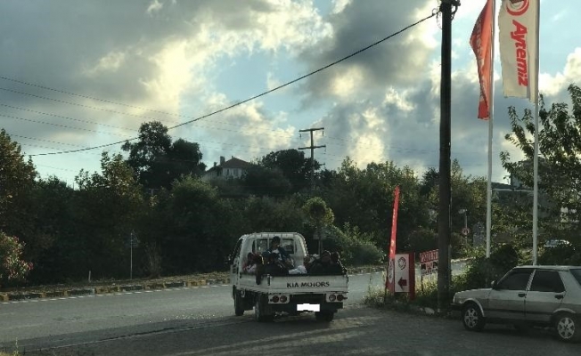 Düzce’nin Akçakoca ilçesinde Fındık işçileri tarlalara kamyonet ve traktör kasalarında taşınmaya devam ediyor.