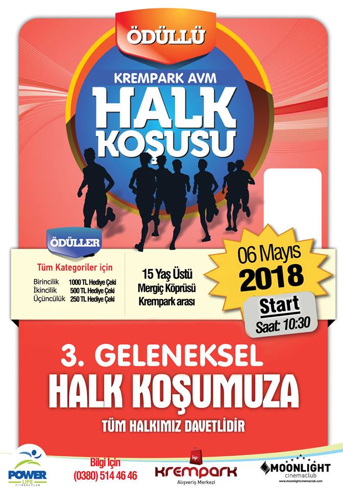 Krempark Avm tarafından 3. Geleneksel Halk Koşusu 6 Mayıs Pazar günü yapılacak. Düzce’nin ilk alışveriş merkezi olma özelliğini taşıyan Krempark Avm yönetimi tarafından organize edilen koşu Mergiç Köprüsü ile Avm arasındaki mesafede koşulacak. Müracaatlar Avm yönetimine yapılacak.