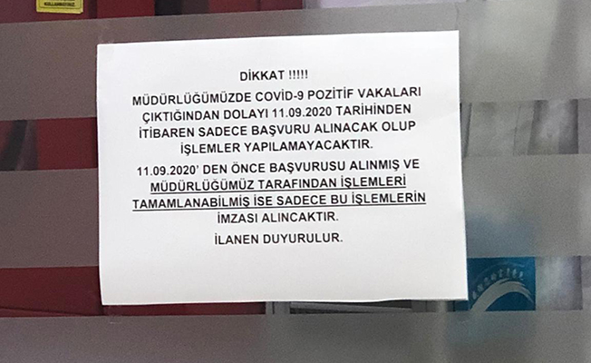 Düzce Valiliği içerisinde bulunan müdürlük girişine asılan duyuru yazısında şunlar kaydedildi: “Dikkat! Müdürlüğümüzde COVİD-19 vakaları çıktığından dolayı 11 Eylül 2020 tarihinden itibaren sadece başvuru alınacak olup işlemler yapılmayacaktır. 11 Eylül 2020’den önce başvurusu alınmış ve müdürlüğümüz tarafından işlemleri tamamlanabilmiş ise sadece bu işlemlerin imzası alınacaktır. İlanen duyurulur.”
