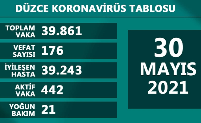 30 Mayıs itibariyle Düzce genelinde tespit edilen vaka sayısı 38’e geriledi. Tespit edilen son vakalarla birlikte COİD-19’a yakalananların sayısı 39 bin 861’e yükseldi. Nisan ayını ikinci yarısında günlük vaka sayısının 340’a yükseldiği ve neredeyse her gün acı haberin geldiği Düzce’de o tablodan eser kalmadı. Yaklaşık 40 günlük süre zarfında Düzce’de günlük vaka sayısındaki düşüş yüzde 90’ı gördü.