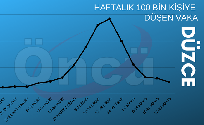 Verilere göre 15-21 Mayıs haftasında 466 olan haftalık vaka sayısı bu hafta 358’e geriledi. Düzce'de günlük ortalama vaka 52 oldu. Bu hafta itibariyle yeniden turuncu kategoriye gerileyen Düzce’de bir sonraki hedef ise haftalık 100 bin kişiye düşen vaka sayısının 50’in altına indirilmesi ve mavi renge bürünmek.