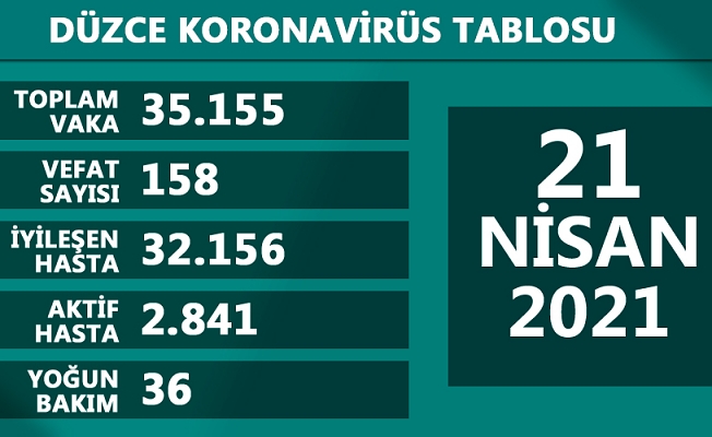 Kentte COVİD-19 vaka sayısında da 35 bin sınırı aşıldı. 20 Nisan Salı günü 345 vatandaşın daha testinin pozitif çıkmasıyla Düzce’de salgına yakalananların sayısı 35 bin 155’e çıktı.