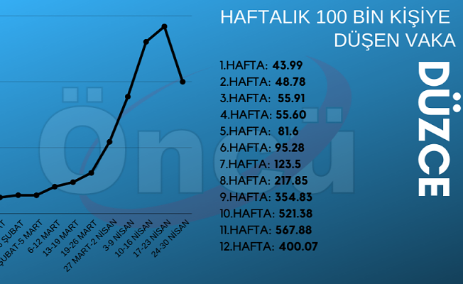 İki hafta önce yaşanan artış oranında Türkiye’de zirveye oturan Düzce’den de sevindiren haber geldi. Tam 12 haftadır üst üste yaşanan yüksek artışlarla salgının kontrolden çıktığı Düzce’de açıklanmaya başladığı günden bu yana ilk kez haftalık vaka sayısında düşüş yaşandı. Önceki hafta haftalık yüz bin kişiye düşen vaka sayısı 567 olan kentte bu sayı 400’e geriledi.