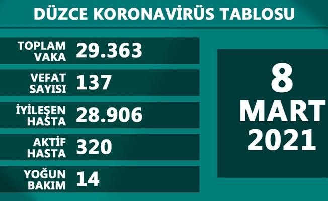 Düzce’de bugün itibarı ile toplam vaka sayısı 29 bin 363’e ulaşırken, toplam iyileşen sayısı ise 28 bin 906’’yı buldu. 14 ağır hastanın Düzce Atatürk Devlet Hastanesi Pandemi Yoğun Bakım Ünitesinde tedavisi devam ederken, salgın hastalığa bağlı ölenlerin sayısı ise 137 kişi olarak kayıtlara geçti. Düzce genelinde bugün itibari ile 320 aktif hasta bulunuyor.