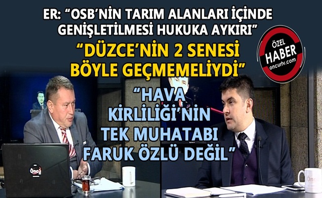 Programda, Düzce 1. Organize Sanayi Bölgesinin genişletilme çalışmalarından, Belediye Başkanı Dr. Faruk Özlü’nün Projelerine, hava kirliliği sorunundan, eski Belediye Başkanı Dursun Ay dönemimde yapılan borçlanmaya kadar birçok konuya değinen Er, 1. OSB’de yürütülen genişletme çalışmalarının tarım alanları içinde yapılmasının yanlı bir politika olduğunu savundu.