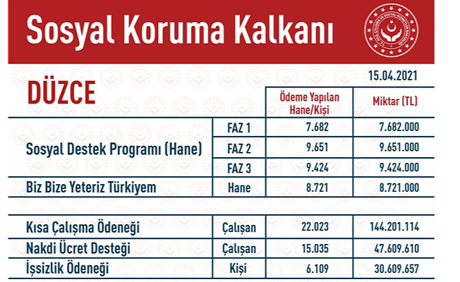 AK Parti Düzce İl Başkanı Mustafa Keskin, 'Kısa Çalışma Ödeneği, Nakdi Ücret Desteği, İşsizlik Ödeneği, Sosyal Destek Programı, Normalleşme Desteği ve Biz Bize Yeteriz Türkiyem' şeklinde yardımların yapıldığı tabloyu sosyal medya hesabından paylaştı. Açıklanan tabloya göre Sosyal Koruma Kalkanı'ndan Düzce’ye toplam 285 milyon 342 bin 835 liralık destek verildi.