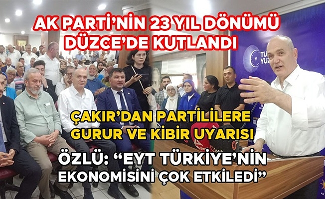 Cumhurbaşkanı Recep Tayyip Erdoğan liderliğinde kurulan AK Parti’nin 23’üncü kuruluş yıldönümü Düzce’de düzenlenen törenle kutlandı. Törende konuşan AK Parti Kurucu İl Başkanı ve eski Milletvekili Fahri Çakır, partililere gurur ve kibir uyarısında bulundu. Çakır, “AK Parti geçtiğimiz yerel seçimlerde maalesef Türkiye’nin ikinci partisi oldu. Bunun elbette baş sebebi ise ekonomi, ikincisi ise gurur ve kibir. Partimizin kurduğu sofrada, her seçimde kapı kapı dolaşarak oy isteyen başörtülü kadınlarımız, maalesef yer bulamadı. Bu masada, yöneticiler ile birlikte maalesef bir bardak çay bile içemedi” dedi. Düzce Belediye Başkanı Dr. Faruk Özlü, ise Türkiye’de yaşanan ekonomik sıkıntıların en kısa süreçte aşılacağına inandığını söyledi.