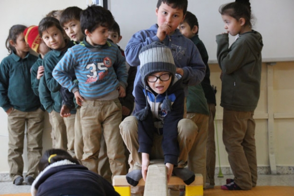 Öğrenciler, 2023 vizyon programı kapsamında okulda oluşturulan uygulama sınıfında fiziksel aktivitelerle vakit geçiriyor.