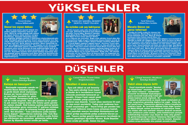 Dursun Ay. Düzce Belediye Başkanı. Hastanede cenazede camide cemiyette Düzce Belediye başkanı gördü desek eksik söylemeyiz. Kurşun yer haram yemez dediler şu ana kadar haramlık bir adımı dahi olmadı. Korumasız halk la iç içe bir irade sergiledi. Ama gel gelelim se var görüntü yok misali bugüne kadar elle tutulur gözle görülür bir eylemi olmadı. Özel kaleme yankını getirip belediyede bulunduğu görev sürecinde 27 yakınını istihdam ettiği iddiaları parti ile istişareyi kestiği görüntüsü verdi. Hal dilindeki “ Yola çıktıklarını yolda bulduklarına değişti” eleştirilerine muhatap oldu. Eski Başkan Mehmet Keleş i sık ziyareti akıllara acaba Keleşten etkileniyor mu sorusunun gelmesine sebep olan Dursun Ay düşenler birinci sırada yer buldu.